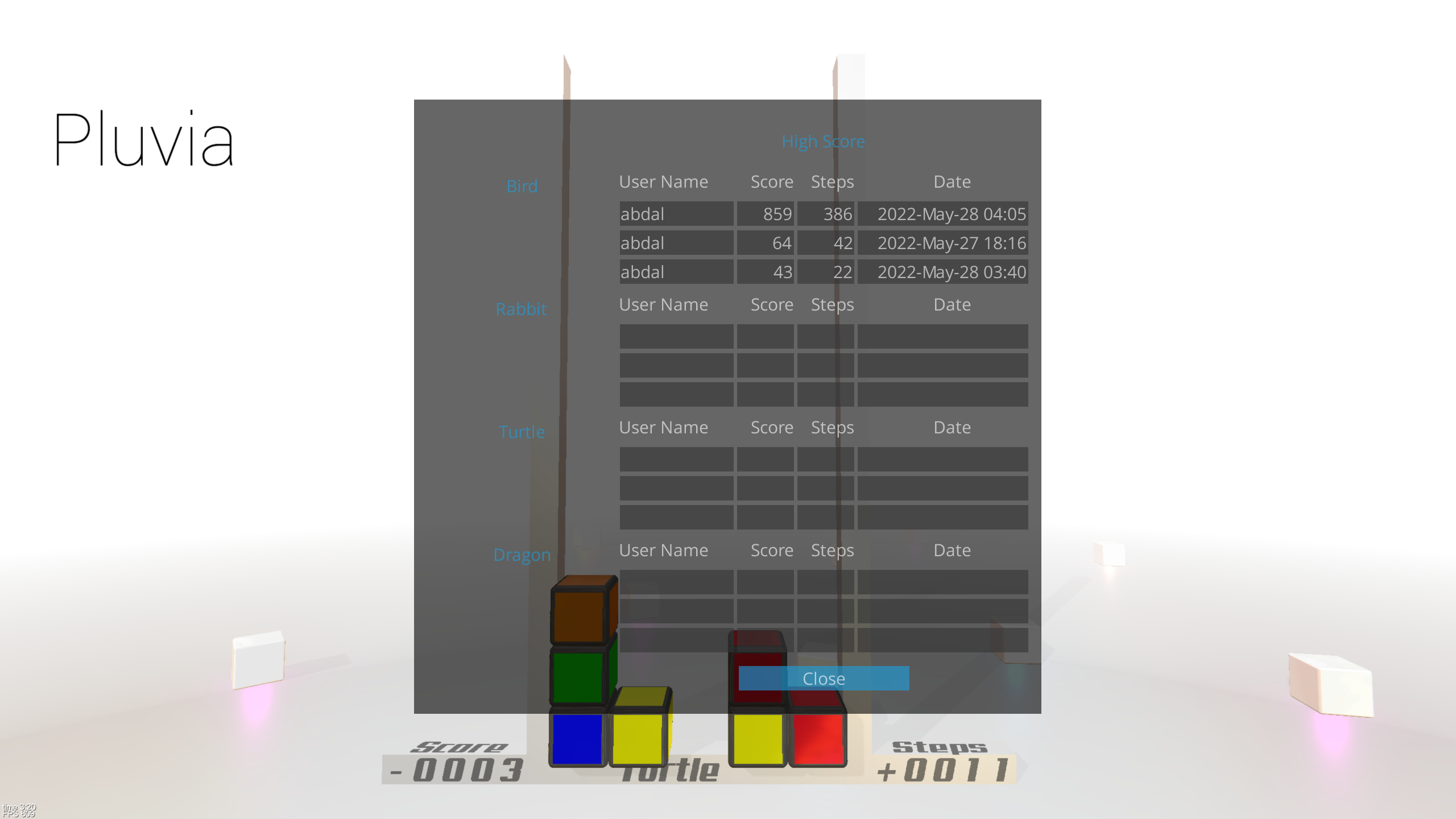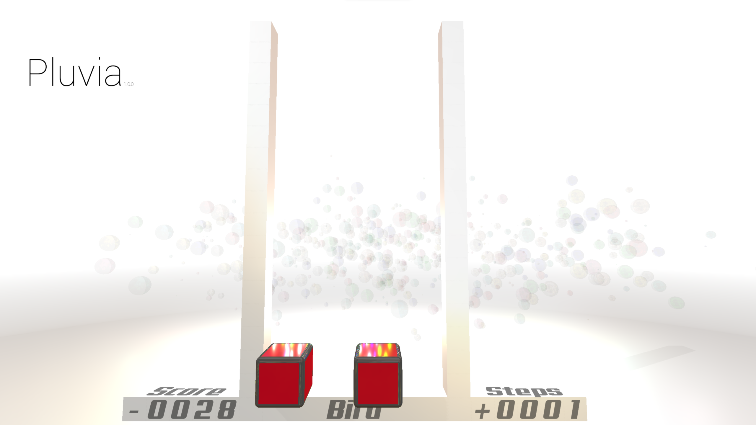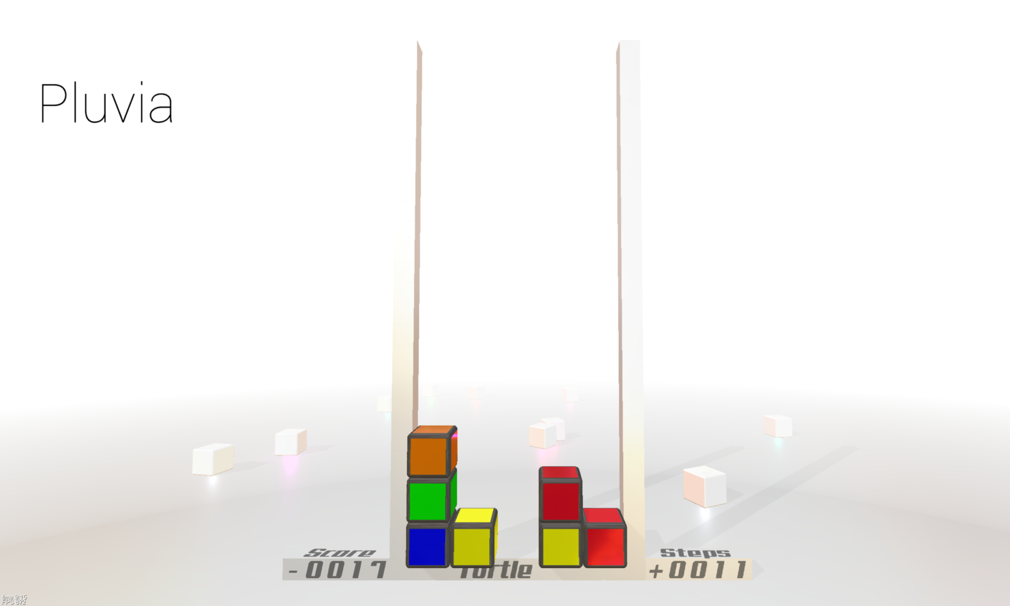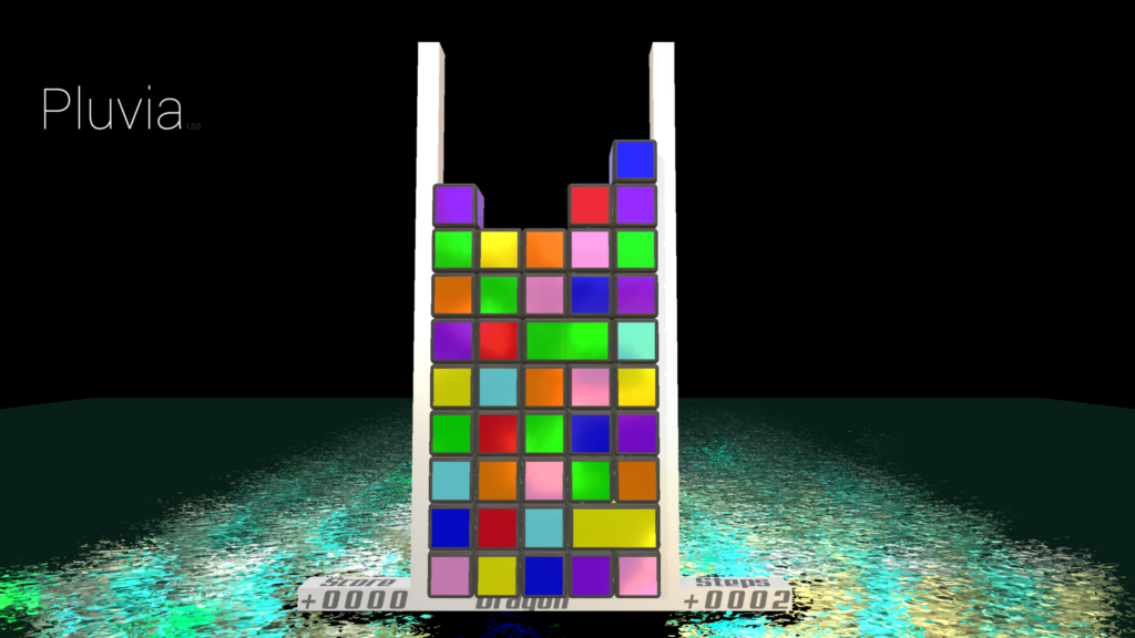 In a Pluvia game, stones of different color drop from above onto each other to form gradually a heap that will eventually reach the top of the screen and end the game. Each stone that drops into the game screen increments the score one point.